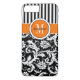 Este funda Funda-personalizado de Mate para iPhone 7, blanco y negro personalizado, tiene un amortiguador floral y un patrón de fondo rayado con un naranja y banda blanca y círculo para añadir su nombre, iniciales, monograma u otro texto. ¡Este nuevo funda moderno y de moda hace una declaración de moda para el joven y moderno modistonista! Si necesita ayuda, envíe un correo electrónico a niteowlstudio@gmail.com.