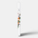 Estuche delgado blanco para iPhone con un colage colorido con rostros, flores y frutas.