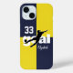 Este estuche para iPhone con temática de fútbol presenta a una jugadora femenina de fútbol con silueta pateando una pelota de fútbol por gol y la palabra "gol" en blanco - fondo azul marino con bloques diagonales de color oro, ambos personalizables - personificar con su nombre y número jersey - por katz_d_zynes