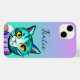 Añade un nombre a este Verde azulado gato morado, rosa y azul gatito con un estuche de teléfono de ojos amarillos.