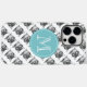 Cute gato con gafas foto nombre personalizado monograma iPhone 14 Funda. Impresión animal divertida con etiqueta azul turquesa. Cubierta telefónica personalizada.