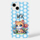 Una adorable gatita sentada en un parche de flores azules y rosas con lunares blancos funda de teléfono personalizada.
