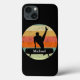 Mens Gymnastics Boys Team Sunset iPhone estuche con su texto o nombre personalizado. Gimnasta masculina fuerte sobre un caballo de pomelo frente a una fresca imagen retro de puesta de sol.