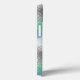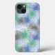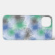 Este estuche de teléfono tiene un diseño moderno de mediados de siglo de starburst en glaucous (azul), gris, azul claro y verde.