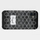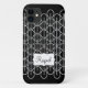 Estuche de iphone con estampado en blanco y negro de 190 óvalos ligados al gráfico. Personaliza con tu nombre o inicial. Actualmente se lee Raquel. Diseño de Sarah Trett.