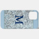 Este diseño monograma presenta un cuadro cuadrado, azul, que rodea una mezcla de colores, en mármol de granito azul, azul claro, amarillo, blanco, gris y negro.