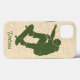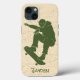 Este estuche de teléfono personalizado presenta un ilustracion de estilo silueta de un patinador de color verde contra un fondo falso de madera.