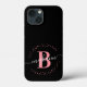 Girly, elegante, de moda, moderno, rosa y negro, blanco, monograma inicial personalizado de guión de nombre monogramado personalizado estuche de iphone monogramado. Con un primer monograma y un guión de nombre ondulado en una caligrafía con letras a mano, el tipo de letra cruz cruzada y el marco de círculo punteado alrededor de tu monograma sobre fondo negro.