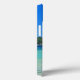 Una maleta telefónica con una fotografía de una playa azul turquesa del océano con grandes rocas esparcidas a lo largo de la costa. Lugar tropical luminoso y soleado.