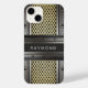 Un estilo industrial fresco y duro para hombres. Acero falso gris y dorado metalizado y remaches. Añade tu nombre, letras blancas.