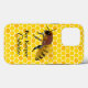 Estuche de teléfono con temática de abejas melíferas hecho con un patrón de peine de miel amarillo y naranja. Gráficos de una abeja grande, decoran el medio. Personalice todo el texto para que se ajuste a sus necesidades.