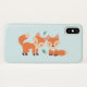 Un estuche de teléfono con un ilustracion gráfico de 2 zorros naranjas que se ven lindos y felices. Fondo azul claro.