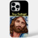 Con una vista incontenible de una inteligencia artificial Jesús que te mira cara Pintando el cabello largo, el pelo facial y los ojos hermosos con un conjunto desenfocado