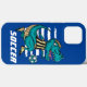 Un estuche de teléfono fresco para jugadores de fútbol y entusiastas, este diseño tiene un brillante fondo azul con un colorido dinosaurio T-Rex en verde verde azulado con una camisa a rayas de un árbitro amarillo y negro que patea una pelota de fútbol. También hay una plantilla de texto para personalizarla con el nombre de un niño u otro texto deseado.