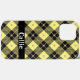 Patrón a cuadros de "leñador" diagonal negro y amarillo pastel con una rejilla dorada mate. Personalizable de texto con letra blanca moderna en este estuche de teléfono personalizado.