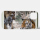 Hermoso arte digital con dos tigres con un efecto 3D que parece estar saltando del marco de la imagen. El fondo está cubierto de jirafa y cebra. El maravilloso arte animal salvaje es una idea maravillosa para los amantes de la vida salvaje.