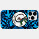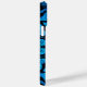 Esta funda de teléfono está decorada con una hermosa silueta de lagarto multicolor brillante en un círculo. El fondo es un patrón negro y azul ondulado con brillo que recuerda al agua.