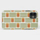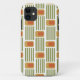 Este estuche de teléfono tiene un diseño moderno de mediados de siglo de cinco líneas verdes y un rectángulo dorado redondeado con un rectángulo redondeado naranja repetido a lo largo del diseño.