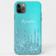 Este diseño de estuche para iPhone bonito presenta una textura metálica purpurina de chuleta acuática y turquesa goteo y una elegante fuente caligráfica.