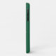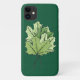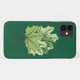 Estuche Primavera para iPhone con arce verde deja arte digital con un ilustracion decorativo de hojas primaverales sobre fondo verde oscuro moteado.