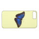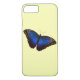 Hermosa mariposa morfa azul puesta sobre fondo amarillo pálido.