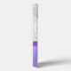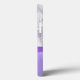 Estuche para iPhone de moda hecho con una apariencia de mármol blanco y morado, en la parte superior y una mirada de Relieve metalizado púrpura, en la parte inferior del funda. Los gráficos de una cinta de lavanda, que se ejecuta entre los dos fondos y un blanco con un área de texto con marco purpurinoso púrpura, tienen texto púrpura listo para personalizar, para satisfacer sus necesidades.