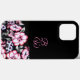 Este gráfico floral, se muestra en un patrón diamantífero, con grupos de flores, pétalos y hojas, en colores mudos; rosa, fuschia, lavanda, malva, verde y blanco - contra un fondo de negro.