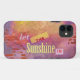 La pared, en el diseño original de ZoeSPEAK en este inspirador Funda del iPhone 11, es una vieja pared de ladrillo rojo con un mural sobre estuco que se está desmoronando. El mural es una imagen de nubes esponjosas al atardecer, todo rosa y amarillo brillante en la parte superior contra un cielo azul profundo. El mensaje es dejar pasar el sol.