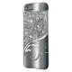 Este elegante, atractivo. vides afiligranadas del diseñador del iPhone del caso de la plata glamorosa de las características en un fondo del purpurina y del metal plateado de plata. Productos a juego disponibles. Para las preguntas/las peticiones, correo electrónico: cheryl@cheryldanielsart.com. Diseño original de las "vides afiligranadas" por el © 2014 de Cheryl Daniels.