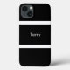 Estuche de teléfono móvil minimalista, moderno y elegante con un patrón de rayas blancas y negras. Grandes rayas negras y pequeñas rayas blancas. Personalizado con su nombre impreso en un texto en blanco.