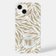 Un estuche elegante para teléfonos celulares presenta tu monograma inicial en un patrón de impresión animal de rayas de cebra beige. ELIJA SU MODELO Y HACER EL PEDIDO. Crea por ti mismo o dámela como regalo. Bolsa de aletas, etiqueta de equipaje y más artículos de nuestra colección de viajes.