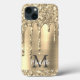 Elegante, moderno, purpurina de oro girado gotea un nombre metalizado personalizado personalizado y estuche de iphone monogramado. Este diseño presenta goteos espumosos de purpurina dorado amarillo sobre fondo metalizado cepillado dorado con plantilla de texto de monograma inicial y de primer nombre personalizada personalizado. Un regalo femenino perfecto para chicas y mujeres que aman las cosas de moda del bonito. Si necesitas ayuda o elementos coincidentes, por favor contacta conmigo.