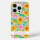 Customize this gorgeous modern sunflowers with pink zinnias painting iPhone 15 pro case with your your name in a trendy modern CAP font in pink on white. It's so beautiful and happy!
