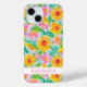 Customize this gorgeous modern sunflowers with pink zinnias painting iPhone 15 pro max case with your your name in a trendy modern CAP font in pink on white. It's so beautiful and happy!