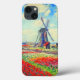 funda del iPhone 13 con la pintura de la flor y el molino de viento de Claude Monet. Hermosos y coloridos campos de tulipanes rojos, rosados y amarillos junto a un molino de viento y casa en Holanda. Un gran regalo de Monet para los amantes del impresionismo y el arte francés.