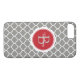 Un estuche de teléfono celular personalizado moderno, gris y rojo, con un patrón de quatrefoil en el fondo. Añade tu monograma y nombre. Diseñado para ti por Blackberry Boulevard.