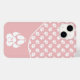 Este diseño se divide con una forma de onda divertida. En la parte inferior hay una huella de pata de perro blanco que tiene un monograma personalizable rosado. En la parte superior hay un patrón de huellas de perros blancos con un color de fondo rosado.