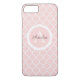 Un estuche de teléfono celular personalizado moderno, rosa y bonito con un patrón de quatrefoil en el fondo. Añade tu monograma y nombre. Diseñado para ti por Blackberry Boulevard.