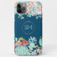 Este estuche de teléfono presenta un diseño floral moderno con un monograma de oro falso sobre un fondo azul océano con cactus, flores suculentas y corales. Personalízalo con tus propias iniciales.