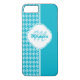 Una moda azul acuático y turquesa Barely There iPhone 7 Funda con un patrón de patas de gallo en franjas verticales. Personalice a este funda de dispositivos móviles contemporáneos en un tono moderno de agua y turquesa añadiendo el nombre y las iniciales de monograma de la joven de moda.