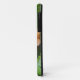 La flor del hibisco naranja que vemos en la fotografía original de MaeFlowers en este Funda del iPhone 11 está asomando desde algunos frondas verdes del helecho en un hermoso jardín. La flor está en plena floración, con sus bordes ondulados que sobresalen del fondo de los helechos. La forma de la flor es como una trompeta, curvándose hacia el exterior, con tallos amarillos coronados con puntos rojos en el centro de la flor. La foto es un armario que muestra el detalle en los pétalos de flores de esta belleza de color melocotón.