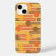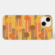 Este estuche de teléfono tiene un diseño moderno de mediados de siglo de repetición de rectángulos en naranja, oro y marrón con círculos sobre la parte superior.
