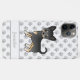 El original ilustracion personalizado de Destei de un perro de raza chihuahua negro y morena. También hay un área de texto personalizable para un nombre. El fondo tiene un patrón de huellas de perros grises.