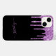 Estuches de teléfono elegantes, de chicas y de cristal. Purpurinas falsos de color morado y lavanda gotean. Un fondo negro de moda. Personalice y agregue un nombre, escrito con un estilo de escritura con letras a mano moderno y con cambios. Letras de color violeta. Para que los cambios sólo eliminen el nombre del ejemplo, deje los espacios o la emoji delante y después del nombre.