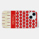 Las bolas de críquet crean un brillante patrón de puntos de polka en un fondo blanco en este estuche deportivo de teléfono. Los murciélagos de críquet también se usan en un patrón complementario. Una banda roja a través del funda tiene espacio para agregar un nombre u otro texto para personalizar.