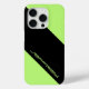 Este funda minimalista para el iPhone es verde neón con una banda negra gruesa diagonal. El texto está en la diagonal en la franja negra. ¡Sencillo pero llamativo! Fácil de personalizar el nombre o borrar el texto de ejemplo. Todos los derechos reservados © 2024 Alan & Marcia Socolik.