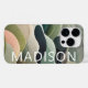 Modern Resumen Patrón Wavy Nombre Personalizado iPhone 14 Pro Phone Cases presenta un patrón ondulado abstracto en gris, verde y rosa con su nombre personalizado en tipografía de escritura blanca moderna. Perfecto para regalos personalizados de Navidad y vacaciones de invierno. Diseñado por © Evco Studio www.zazzle.com/store/evcostudio
