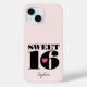 ¡Celebra un dulce dieciséis con un estuche para iPhone personalizado! Perfecto para la estrella de cumpleaños que ama las vibraciones antiguas y el estilo audaz. El diseño se basa en la tipografía de moda retro "Sweet 16", con un corazón de amor. Personalice la plantilla con el nombre del adolescente en un guión moderno. ¡Un regalo genial para una hija adolescente, hermana, sobrina o mejor amiga! Colores impresos: rosa, rosa y negro.