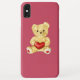 Caso rosado adaptable del iPhone del oso de peluche con un oso de peluche lindo que lleva a cabo un corazón rojo y que le hipnotiza con su mirada unblinking, en fondo rosado suave. Este caso huggable precioso del iPhone del oso de peluche sería un gran regalo para los niños o alguien que usted ama.