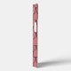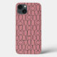 Este estuche de teléfono tiene un diseño art deco de ovales rosas, rectángulos y círculos en líneas horizontales grises que se repiten en filas.